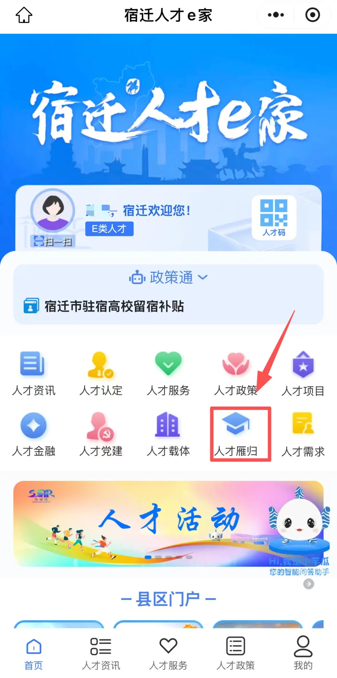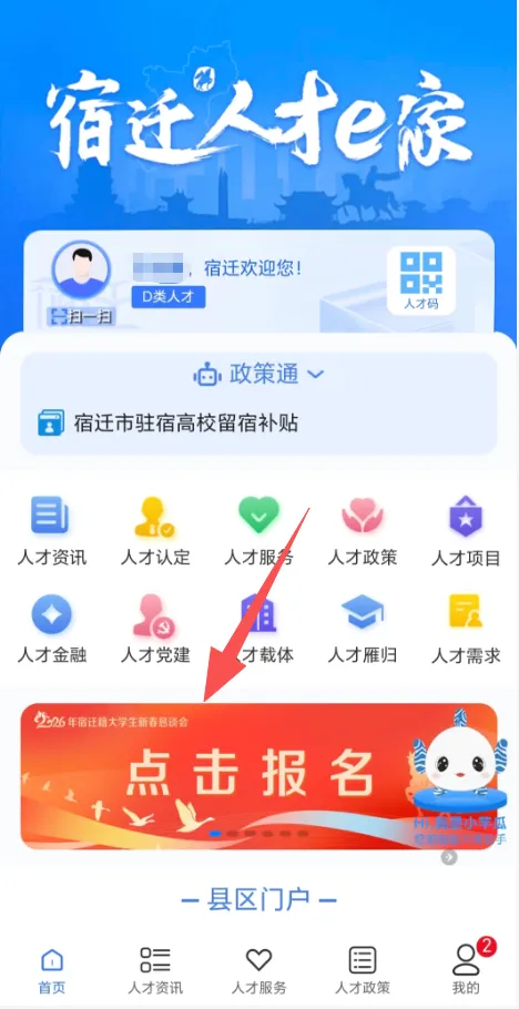 扫描上方报名二维码,进入“宿迁人才e家”页面,完成授权并绑定手机号。