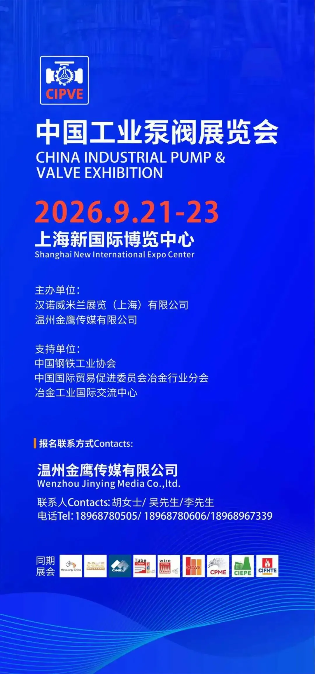 2026中国工业泵阀展览会将于2026年9月21-23日在上海新国际博览中心举办,同期将举行第十五届中国国际钢铁大会、第二十四届中国国际冶金工业展览会、第三届钢结构建筑产业链展览会、第十二届中国国际管材展览会、第十二届中国国际线缆线材展览会、2026中国(上海)国际重型机械装备展览会、第二十届中国国际耐火材料及工业陶瓷展览会、2026中国工业环保设备展览会、2026中国工业炉及热处理装备展览会、2026中国粉末冶金展览会、2026中国焊接与切割装备展览会及一系列同期活动。预计同期系列联展展览面积将达到150,000平米,汇集近三千家企业参展参会。