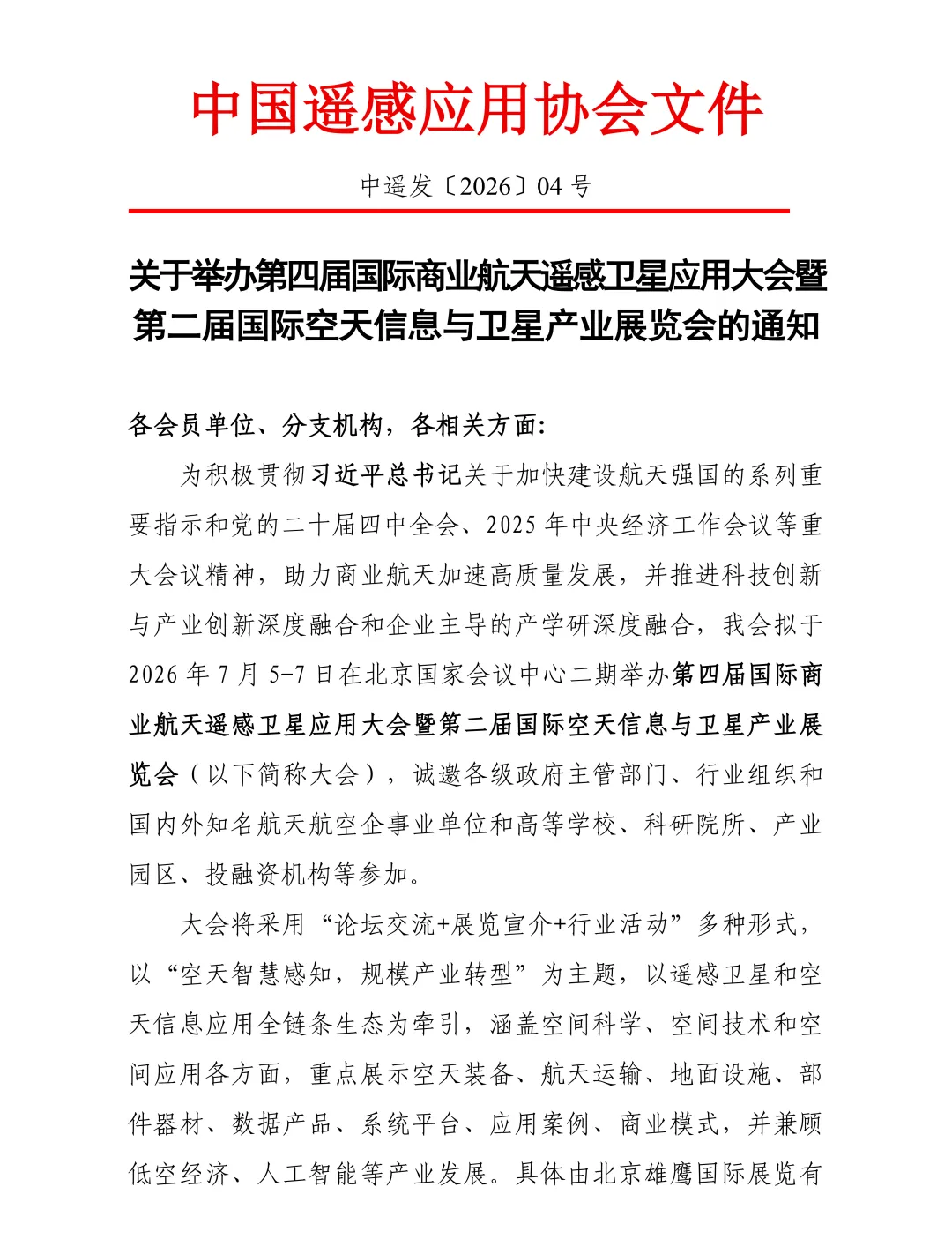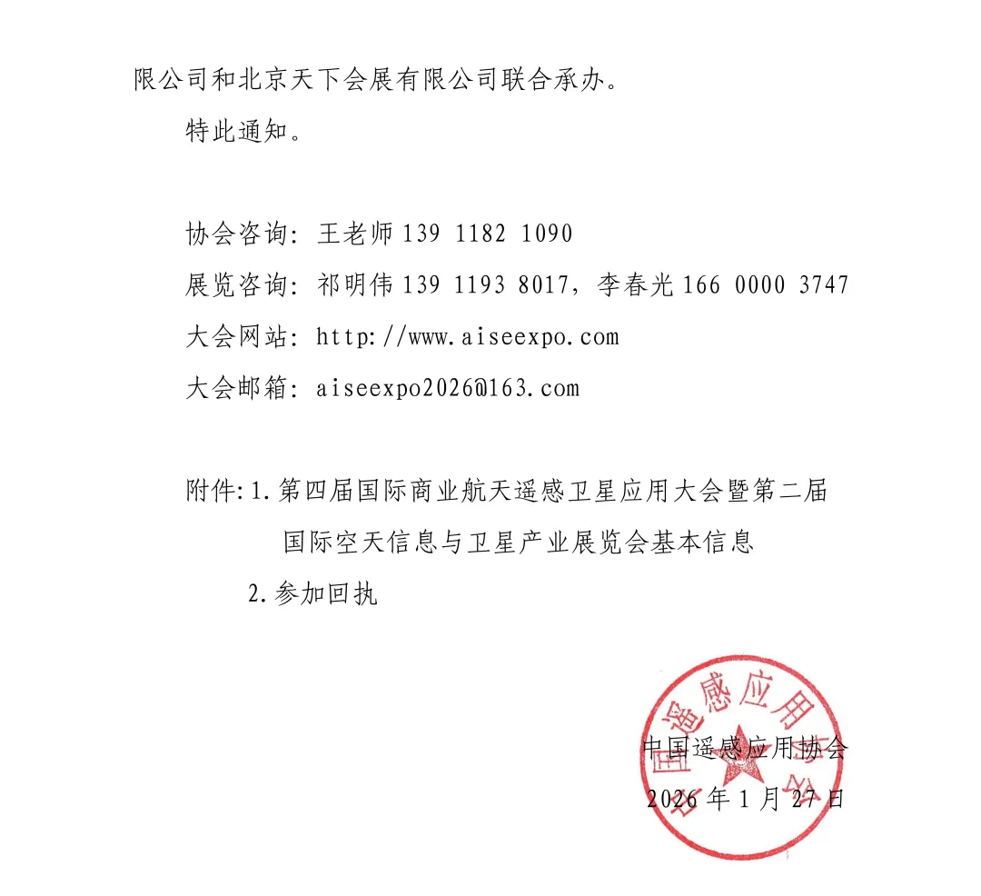 中国遥感应用协会关于举办第四届国际商业航天遥感卫星应用大会暨第二届国际空天信息与卫星览会的通知