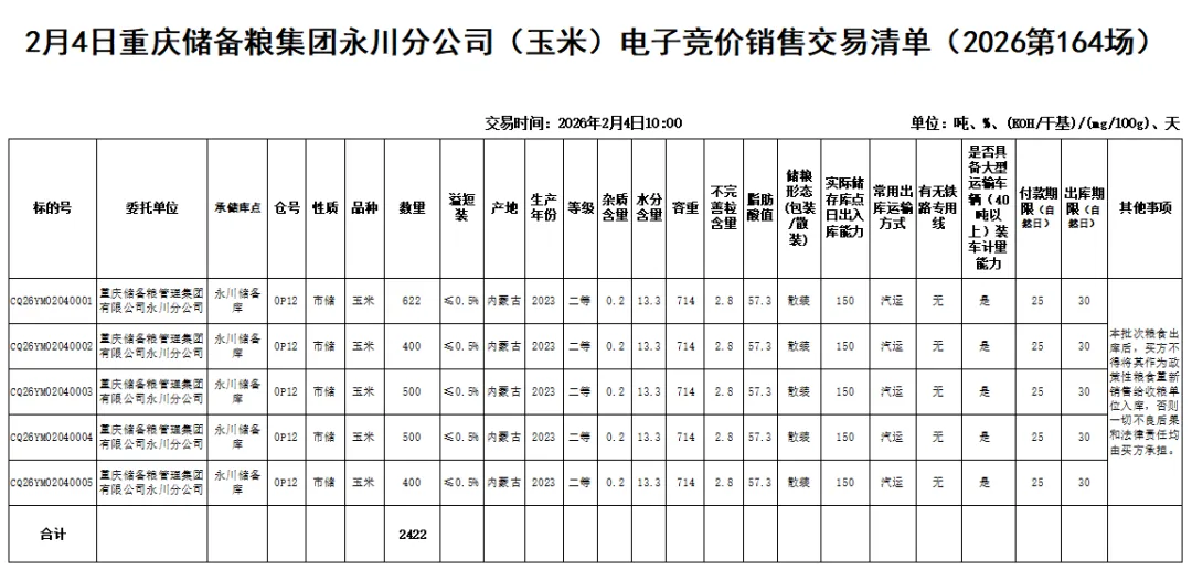 受重庆储备粮管理集团有限公司永川分公司委托,重庆市粮油批发市场有限责任公司(即国家粮食重庆交易中心,以下简称“批发市场公司”),定于2026年2月4日10:00举办重庆储备粮集团永川分公司(玉米)电子竞价销售交易会,现将有关事项公告如下: