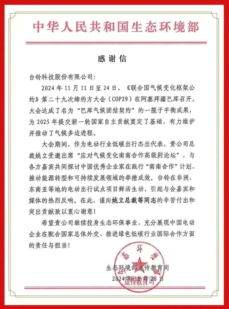 品牌出海对于台铃而言,不仅是市场拓展的必然选择,更是提升品牌全球影响力和竞争力的重要战略举措。作为全球长续航电动车的开创者,台铃一直致力于推动全球低碳出行。自2019年起,作为联合国电动出行合作伙伴,台铃积极拓展海外市场,展现其国际品牌的影响力。2024年,台铃受邀参加联合国气候变化大会(COP29)南南合作高级别论坛表现卓越,并获得生态环境部《感谢信》。面对全球贸易中的风险与机遇,台铃的出海布局也在稳步推进。台铃在全球布局了七大营销中心,并在越南、印尼等东南亚国家打造标杆市场。在本届广交会上,台铃不仅吸引了大量老客户的现场签约,还成功吸引了多个新市场。面对全球市场,台铃以其卓越的产品、先进的技术、强大的品牌实力以及积极的全球布局,为全球消费者带来了全新的出行体验,也为全球新能源出行产业的发展注入了新的活力。随着全球对低碳出行需求的增加,台铃将继续通过技术创新和产品升级,满足不同市场的本土化需求。未来,台铃将坚定品牌出海的信心,并积极规划未来布局。在全球贸易的舞台上以坚定的步伐,引领全球出行新风尚。