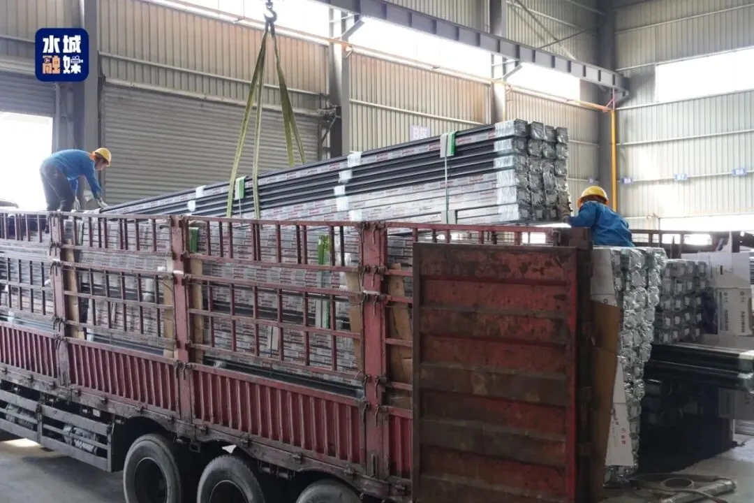 走进十九度铝业生产车间,只见一批隔热断桥铝合金型材和粉末喷涂铝合金型材共计30吨产品正被稳稳吊装上车,即将发往贵阳。 一旁的生产线上,机械臂有序挥舞,工人们专注操作。全员开足马力,确保订单准时交付。