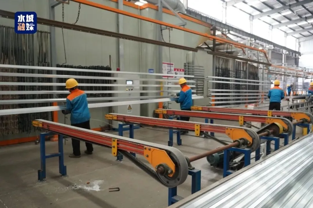 工作人员正将铝型材上排喷涂。田琴 摄
