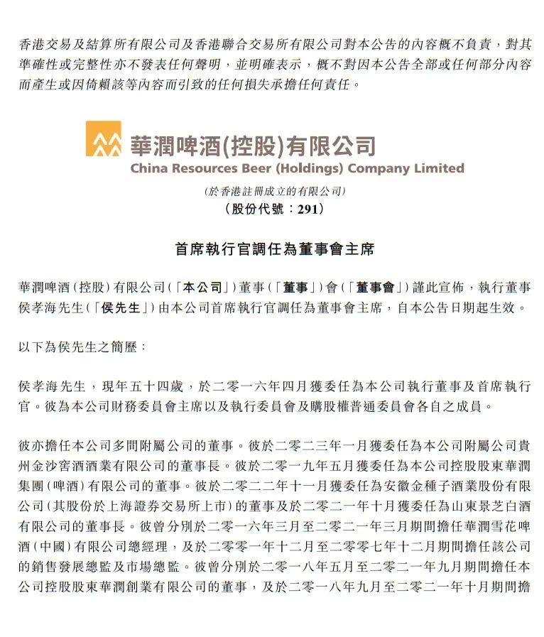 华润啤酒在公告中表示,基于侯孝海的工作经验、领导能力以及工作表现,董事会认为侯孝海是公司董事会主席的最佳人选,由侯孝海担任董事会主席必能推动华润啤酒及附属公司实现进一步发展。据了解,侯孝海于2001年加入华润集团,并在华润啤酒旗下公司长期任职。