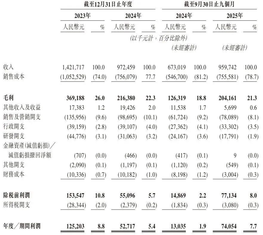 于2023年度、2024年度、2024年截至9月30日止九个月、2025年截至9月30日止九个月,公司录得毛利分别约3.69亿元、2.16亿元、1.26亿元、2.04亿元,对应毛利率分别为26.0%、22.3%、18.8%、21.3%。