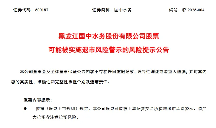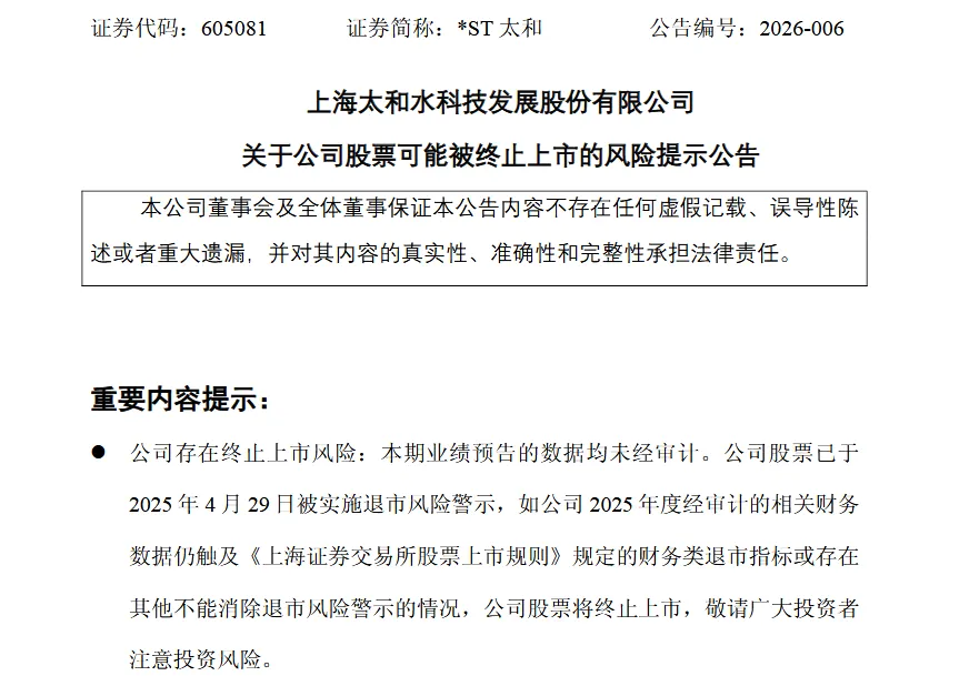 1月29日,启迪环境、国中水务、*ST太和三家环保上市公司发布预亏公告。启迪环境(预亏28亿-35亿元)、国中水务(由盈转亏)预计将被实施退市风险警示,或将披星戴帽;*ST太和持续亏损,站在了终止上市的悬崖边。启迪环境公告,预计2025年度归母净利润亏损28亿元-35亿元,上年同期亏损30.58亿元。根据公司本次业绩预告,预计公司2025年度期末归属于母公司净资产为负值。如果公司2025年度经审计的期末归属于母公司净资产为负值,根据《深圳证券交易所股票上市规则》第9.3.1条第(二)项之规定,公司股票交易可能在披露2025年年度报告后,被深圳证券交易所实施退市风险警示(股票简称前冠以“*ST”字样)。国中水务公告称,预计2025年度实现归属于母公司所有者的净利润亏损1.3亿元到1.04亿元,上年同期净利润4357.92万元,同比由盈转亏。公司将触及《上海证券交易所股票上市规则》相关规定的对公司股票实施退市风险警示的情形,公司股票在2025年年度报告披露后可能被实施退市风险警示(股票简称前冠以“*ST”字样)。此外,*ST太和披露2025年度业绩预告,预计2025年实现营业收入3.8亿元至4亿元;归母净利润亏损2.04亿元至2.44亿元,上年同期亏损3.34亿元;扣非净利润亏损1.8亿元至2.2亿元,上年同期亏损3.41亿元。公司股票已于2025年4月29日被实施退市风险警示,如公司2025年度经审计的相关财务数据仍触及《上海证券交易所股票上市规则》规定的财务类退市指标或存在其他不能消除退市风险警示的情况,公司股票将终止上市。| 免责声明:环联资讯转载其他平台的内容,出于传递更多信息而非盈利之目的,同时并不代表赞成其观点或证实其描述。转载内容版权归原作者所有,若有侵权,请联系我们修改或删除。 |