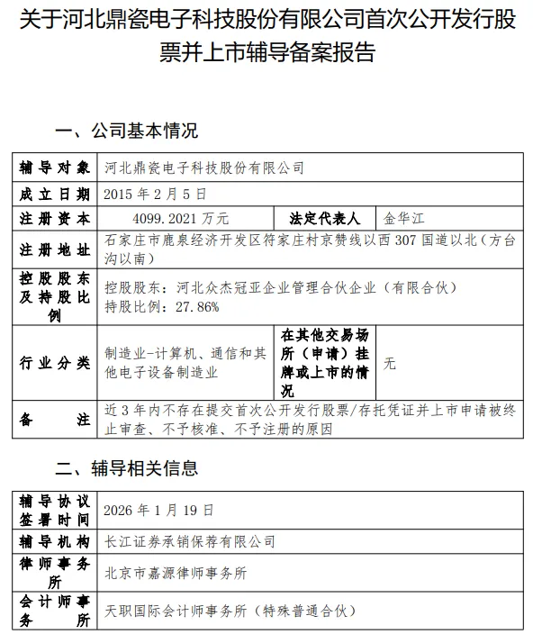 1月27日,河北鼎瓷电子科技股份有限公司(简称:鼎瓷电子)在河北证监局完成IPO辅导备案登记,辅导机构为长江证券承销保荐。