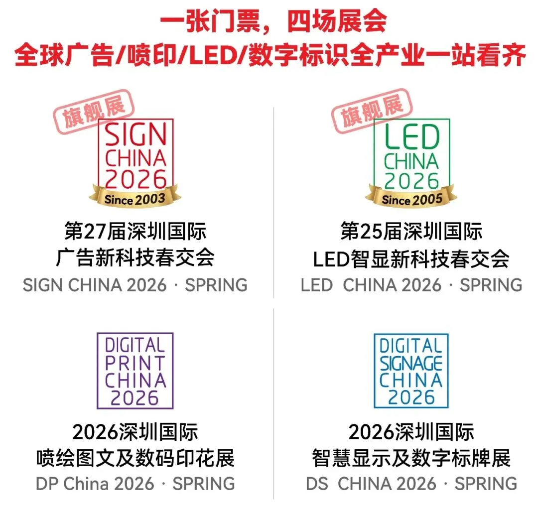作为2026开年首展,本次展会以“四展联动、资源融合”为特色,同期举办国际LED显示屏及照明展、国际智慧显示及数字标牌展、国际喷绘图文及数码印花展,构建覆盖全产业链的一站式采购平台。