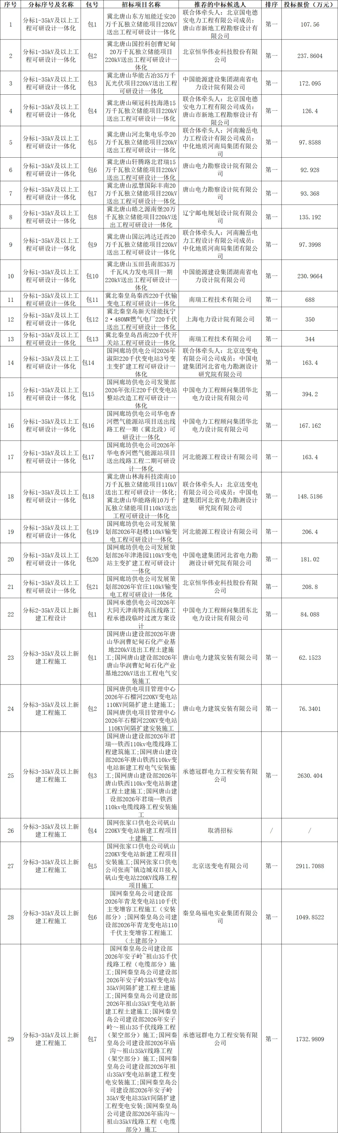 国网冀北电力有限公司2026年电网工程服务第一次公开招标采购标采购(招标编号:JB26-GCFW-ZB01-0126G1)评标工作已经结束。依据《中华人民共和国招标投标法实施条例》、《招标公告和公示信息发布管理办法》对中标候选人公示的规定,现将评标委员会推荐的中标候选人予以公示,公示期 3 日。投标人或其他利害关系人若对评标结果有异议的,请在中标候选人公示期间以书面形式(传真)提出。