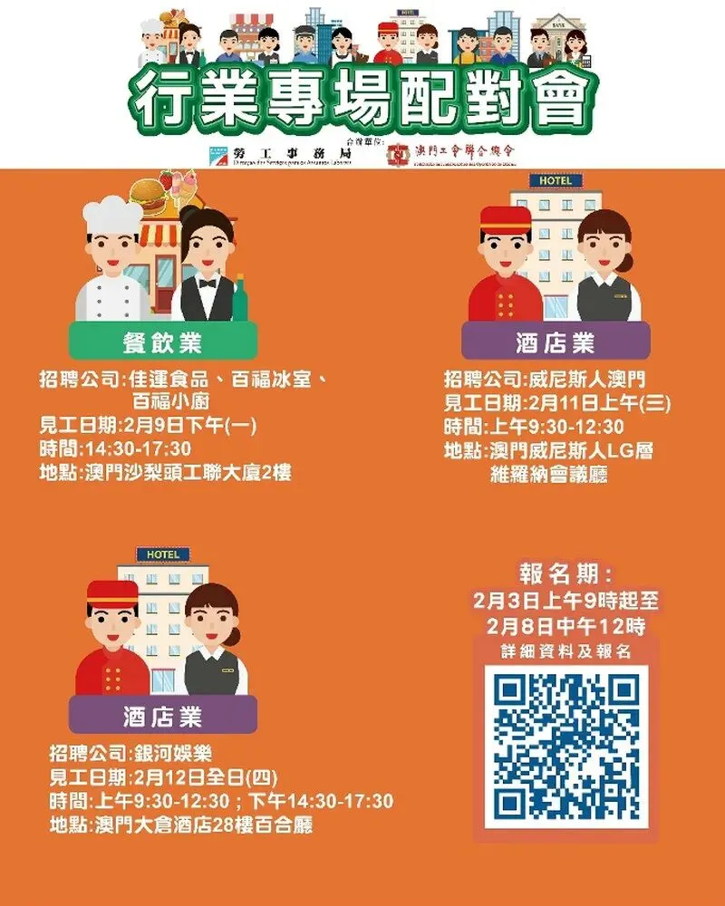 2月9日下午餐飲業專場配對會在澳門沙梨頭海邊街2-6號工聯大廈二樓舉行;2月11日上午酒店業專場配對會在澳門威尼斯人LG層維羅納會議廳舉行;2月12日全日酒店業專場配對會在澳門大倉酒店28樓百合廳舉行。報名日期均由明(3)日上午9時起至2月8日中午12時。