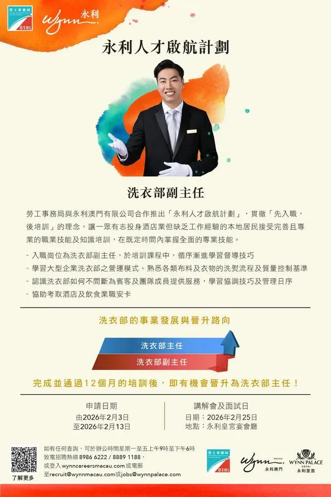 澳門居民如欲了解計劃詳情,可登入勞工局網站內相關專頁,有意參加者可於明日起至2月13日期間網上遞交申請。申請期結束後,永利將陸續通知符合條件的申請人,參加2月25日舉行的講座,隨即安排面試,詳細說明計劃的各項培訓內容及職業生涯發展路徑。