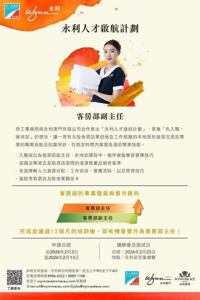 該計劃提供合共18個職位空缺,包括6個“客房部副主任”職位空缺、6個“公眾衛生部副主任”職位空缺及6個“洗衣部副主任”職位空缺。永利將向獲錄取的參加者,安排12個月的專業培訓及工作實踐。培訓內容包括專業行為準則及規範、相關部門營運實務知識、超凡主管技能訓練班,及安排考取澳門職業技能認可基準(MORS)等。