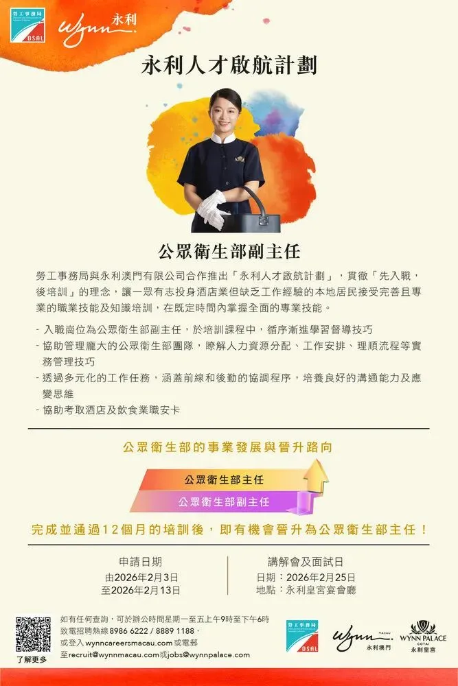 為培育本地人才,進一步提升澳門綜合旅遊休閒產業的國際競爭力,勞工事務局與永利澳門有限公合作推出“永利人才啟航計劃”,以“先入職、後培訓”方式,為本澳居民提供專業培訓及工作實踐機會,計劃由明日起正式接受申請。