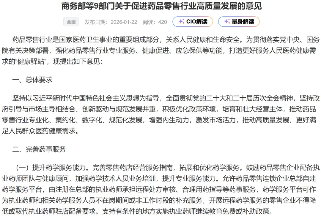2026年1月15日商务部等 9 部门联合印发的《关于促进药品零售行业高质量发展的意见》(以下简称《意见》),作为我国首个专门针对药品零售行业的政策文件,不仅为医药零售企业指明了从传统 “药品销售终端” 向综合 “健康驿站” 转型的方向,更将深刻推动整个药品零售行业生态的巨变与重塑,为行业高质量发展注入强劲动力。