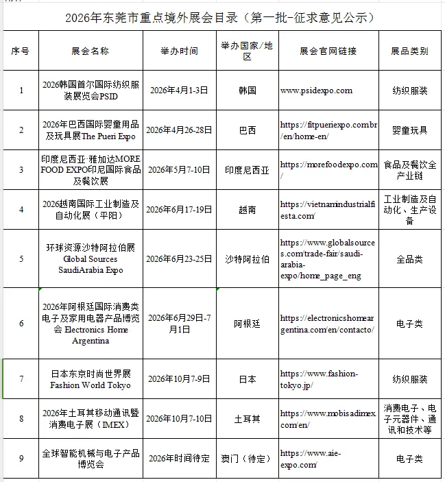 为贯彻落实市委市政府工作部署,鼓励更多东莞企业赴境外拓市场、抓订单,加快培育国际贸易新优势,推动我市外贸稳规模、优结构,前期,我局会同各镇街(园区)商务主管部门和商协会等有关单位广泛收集2026年我市企业参展诉求和组团赴境外参展计划,并结合东莞产业特色,积极推荐优质境外展会,优先选择新兴市场及重点市场的专业类国际品牌展会和自办展。近日,我局根据各有关单位推荐展会和综合评估,结合财政资金安排等实际情况选定首批境外展会计划纳入2026年东莞市重点境外展会目录(第一批),现予以公示。公示期为2月2日-2月8日(共7天)。后续将根据第一批目录实施后的企业参展情况、资金使用情况,以及各级资金安排情况,按照实际需求进行综合评估后再适时研究制定第二批展会目录,其具体范围、数量等将视实际情况动态调整。