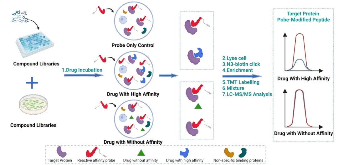药物-靶标相互作用的揭示是现代药物发现的关键步骤。礼达可提供基于光亲和标记蛋白质组分析技术(PAL-AfBPP)和基于活性蛋白质组分析技术(ABPP)的活性化合物靶点鉴定和结合位点鉴定服务。利用化学蛋白组学获得的蛋白质-活性分子结合真实数据,可建立更加精准的靶点-活性化合物结合模型,并进行药物的设计和优化。