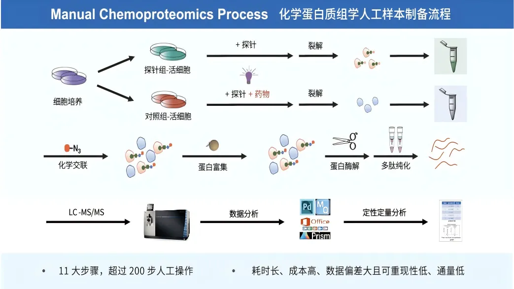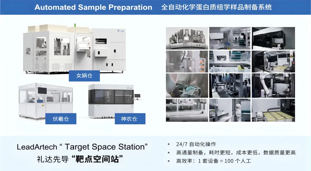 化学蛋白组学的样品制备流程复杂繁琐,传统人工操作不仅费时费力,而且容易出现失误(图3)。礼达先导自主研发的靶点空间站可大大提升实验效率、样品通量、数据准确性和可重复性(图4),突破年处理20000+样本的制备和瞄准大型原创药靶数据库的构建。