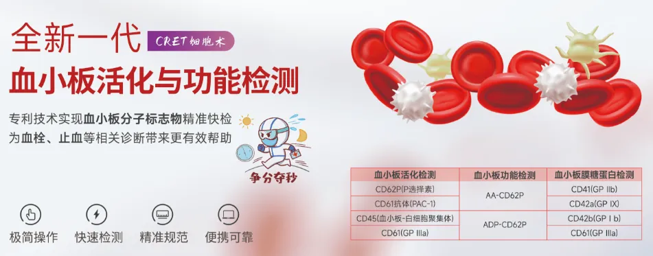 依托CRET技术,企业在POCT平台实现血小板活化功能检测,可在5分钟内完成血小板活化标志物(CD62P、CD61)检测,且检测结果不受血小板浓度影响,有效解决传统流式检测标准化难度大、操作流程复杂等问题。