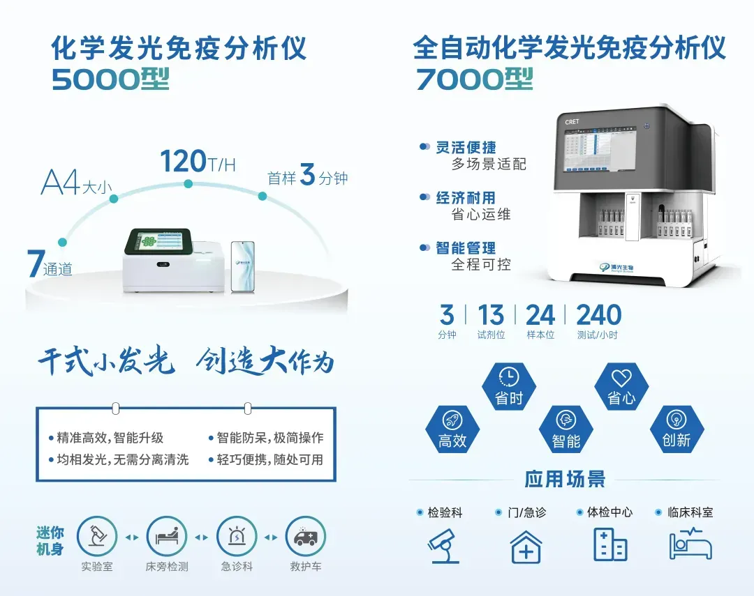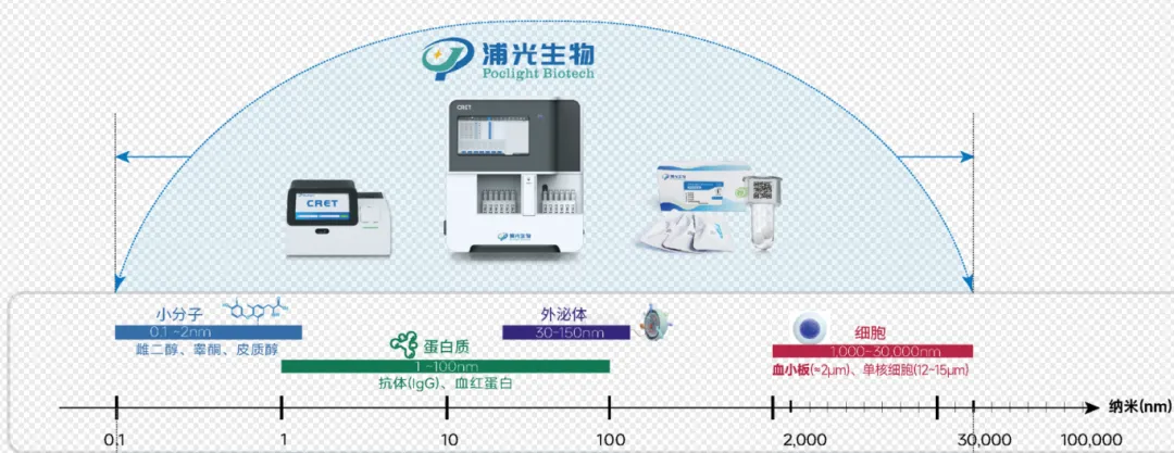 浦光生物深耕均相化学发光免疫检测产品创新研发,公司自主打造的“CRET宽域集成技术平台”,融合基因编辑与免疫诊断技术,可覆盖化学小分子、生物大分子、各类细胞(如血小板)等跨越5个及以上数量级尺寸标志物的精准检测,为用户提供便携、可靠的IVD检测产品。
