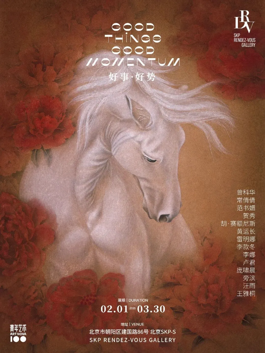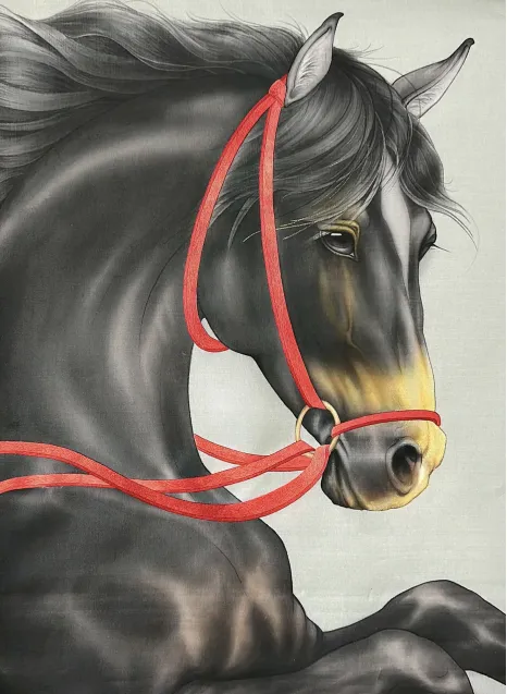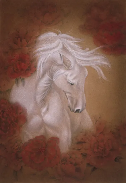 “骥”为良马,以“雪”赋其色,通体皓白的骏马作为主体,以白的纯粹,回归生灵本身的性情。用工笔的细劲线条刻画马的鬃毛与肌理,丝缕分明的银白鬃毛、微垂的眼眸,都是为了勾勒出它温驯又带着孤高的神态;而骨骼与肌肉的明暗铺陈,又意在保留骏马与生俱来的筋骨力道,让这份柔,不是软塌的弱,而是藏着刚的韧。浓烈的红撞着洁净的白,让柔媚的花与矫健的马相融相生。通过这种色彩与物象的碰撞,表达东方美学里“刚柔并济”的内核——刚不是独存的硬,柔也不是孤立的软,二者交织,才是生命最鲜活的模样。看见生灵的多元性情,也能从红与白的交融里,触碰到东方美学中动静、刚柔的和谐之美。