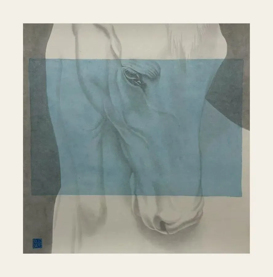 我以国画为创作根基,延续传统笔墨的晕染与线条表现力,融合当代艺术视觉表达逻辑,形成兼具传统气韵与现代思考的风格。创作避开宏大叙事,从白马、薄纱褶皱等日常具象切入,以小见大化作情绪与哲思载体,搭建现实与感知的桥梁,围绕情绪表达与精神探寻创作。《凝》立足传统笔墨,以白马为核心,摒弃奔逸范式专绘面部特写,细腻水墨晕染肌理与凝眸神态,让马脱离符号化成为情绪载体。横切的蓝色矩形为创作突破,作为主观情绪介质制造视觉隔阂,借遮挡与窥视探讨个体与外界的边界、真实与感知的距离。