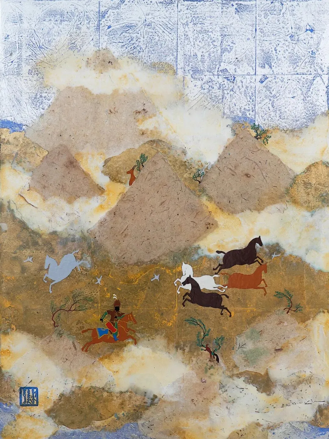 《望经》,即“望着经书里的故事”,是我对祖先美好生活的想象与表达,自 2013 年起创作至今,已完成超 60 幅作品。人类自古便有赋予材料审美意义的传统,古丝绸之路上的珍稀宝石与贵金属,曾作为神圣精神的物质载体,搭建起理想与现实的桥梁,深植于文明脉络。我在本系列中,探寻这种古老审美行为的当代表达,以缅怀祖先的美好过往。创作中以贵金属、珍稀宝石研磨成粉为材料,融合手抄本、细密画与山水画的意象表达,终成《望经》系列的独特面貌。《望经-霞举》,语出房玄龄 “飘然有霞举之志”。