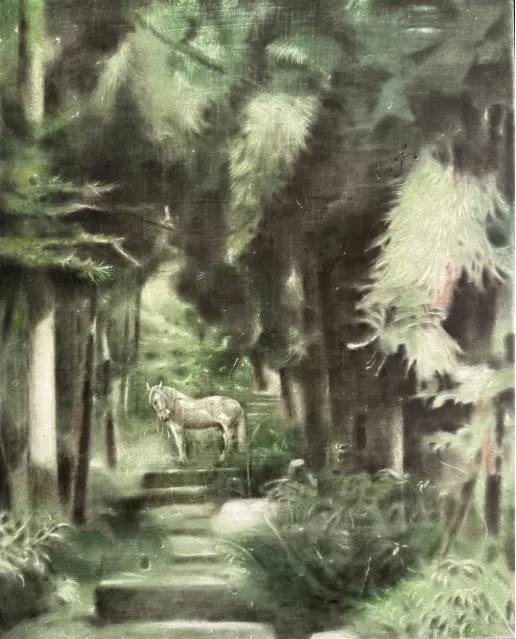 《荫夏》这幅作品是一件坦培拉作品,对于色彩和笔触都是一种新的尝试,相比于我的丙烯作品,颜色和笔触之间微妙的变化更丰富,密林深处投射进来的一束光,打在马背上,周围虽是暗沉的荫夏影子,但是希望就像这束光一样,一直存在。