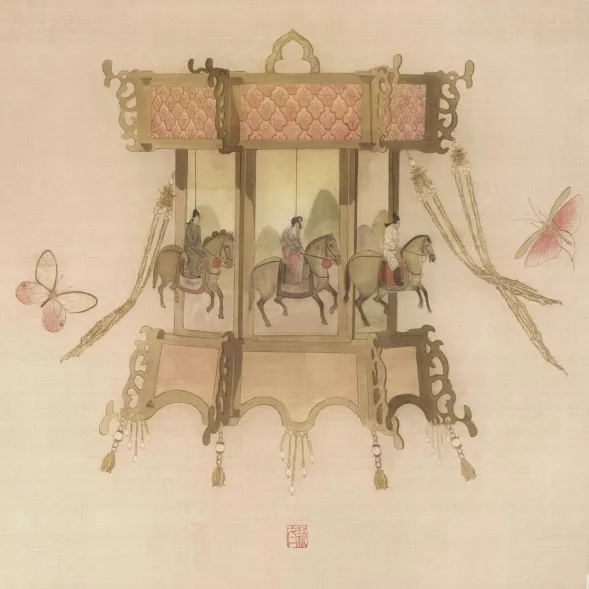 《旋木》借用了唐代名画《虢国夫人游春图》的形象,构图灵感来自明代闵齐伋刻本《西厢记》。想表达的是虢国夫人作为一位贵族女性,虽然很光鲜,但她的出游必然不是随意的,她的游玩路线可能是被指定的,是被她的皇家身份所控制的,所以这种奢华的旅行好像被限制在一个旋转木马上。在成年人的世界里,我们也经常有这种在华丽的场合遵循固定的模式表演的时刻。