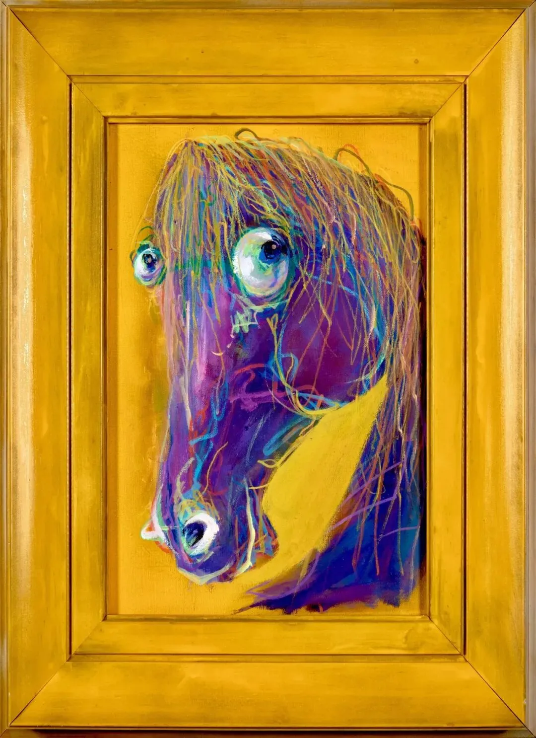 在这⼀系列中,王雅桐突破了⾃⼰早期作品中相对沉稳内敛的⻛格,转向更为活泼、充满活⼒的表达。这种转变不仅反映了艺术家个⼈⽣活状态的变化,也体现了她对艺术形式本身的持续探索。通过将泡沫板、油画、⾦丝等不同材质并置使⽤,艺术家创造出⼀种视觉上的张⼒和对⽐,使作品在保持⻢元素核⼼意象的同时,呈现出更为丰富多元的艺术效果。