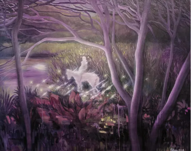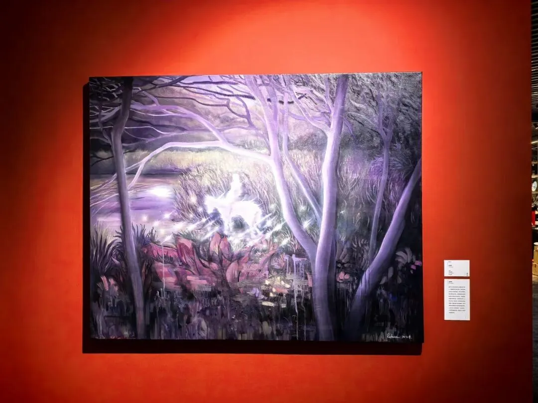 《丛林中》森林弥漫着梦幻紫色,朦胧光影交织。白马与骑者的身影若隐若现,宛如从梦境深处走来,他们仿佛在这片奇幻之境中执着探寻,似在与神明交流,引领思绪飘向未知,并共同构建出引人探寻的精神世界。