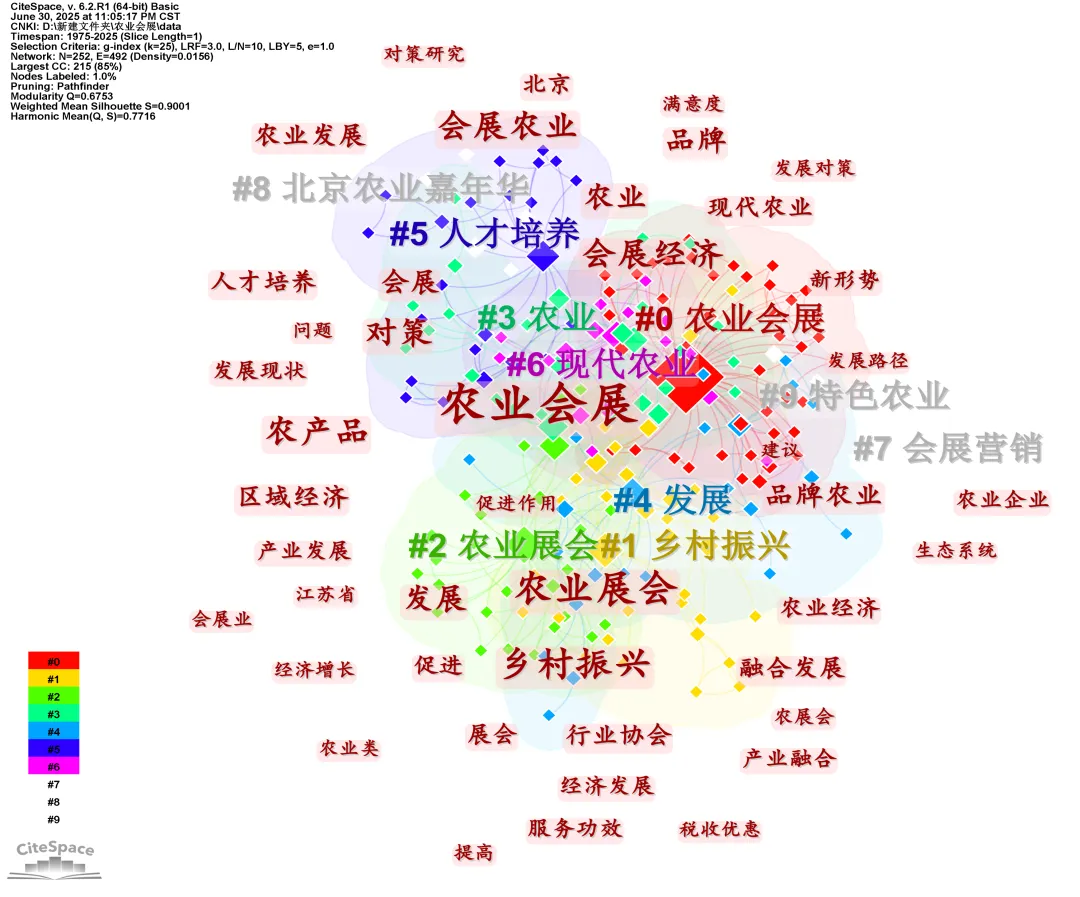 通过软件的自动聚类功能生成的10个聚类如图2所示,依次分别是:“0”农业会展、“1”乡村振兴、“2”农业展会、“3”农业、“4”发展、“5”人才培养、“6”现代农业、“7”会展营销、“8”北京农业嘉年华、“9”特色农业。从图2来看,网络节点数量为252,连线数量为492,网络密度为0.0156,Modularity Q值为0.6753,Silhouette S值=0.9001,说明生成的聚类结果较为可信。