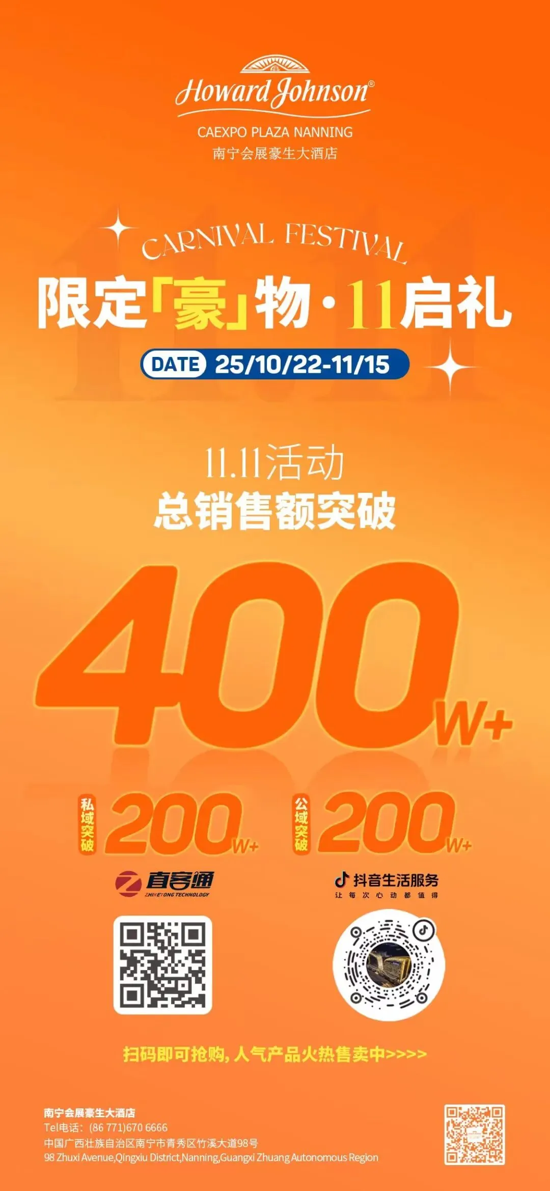 一系列务实举措推动酒店数字化营销成果实现跨越式增长:2025年,抖音渠道销售额从早期探索的小体量规模起步,跃升至近900万元;“双十一”线上营销活动总销售突破400万元,其中抖音渠道贡献超200万元,自助餐券单款销量1万余张,拿下广西酒店餐饮直播历史新高,成为酒店抖音营销的标杆产品。