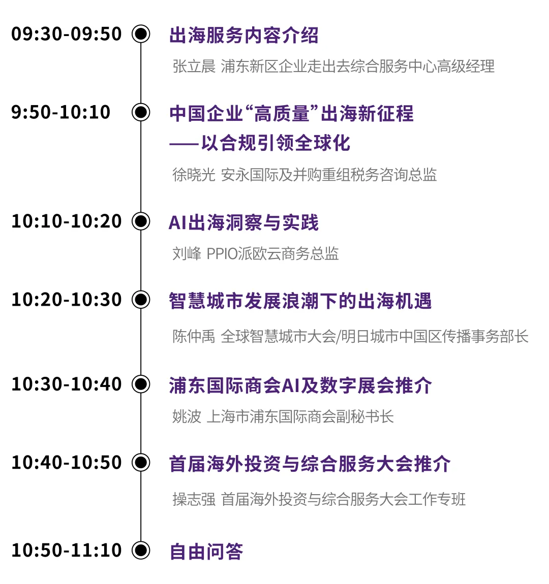 浦东新区企业走出去综合服务中心、安永、PPIO、全球智慧城市大会、浦东国际商会等相关负责人悉数到场,他们带来的不只是分享,更是可对接的服务、可用的政策、可合作的渠道。