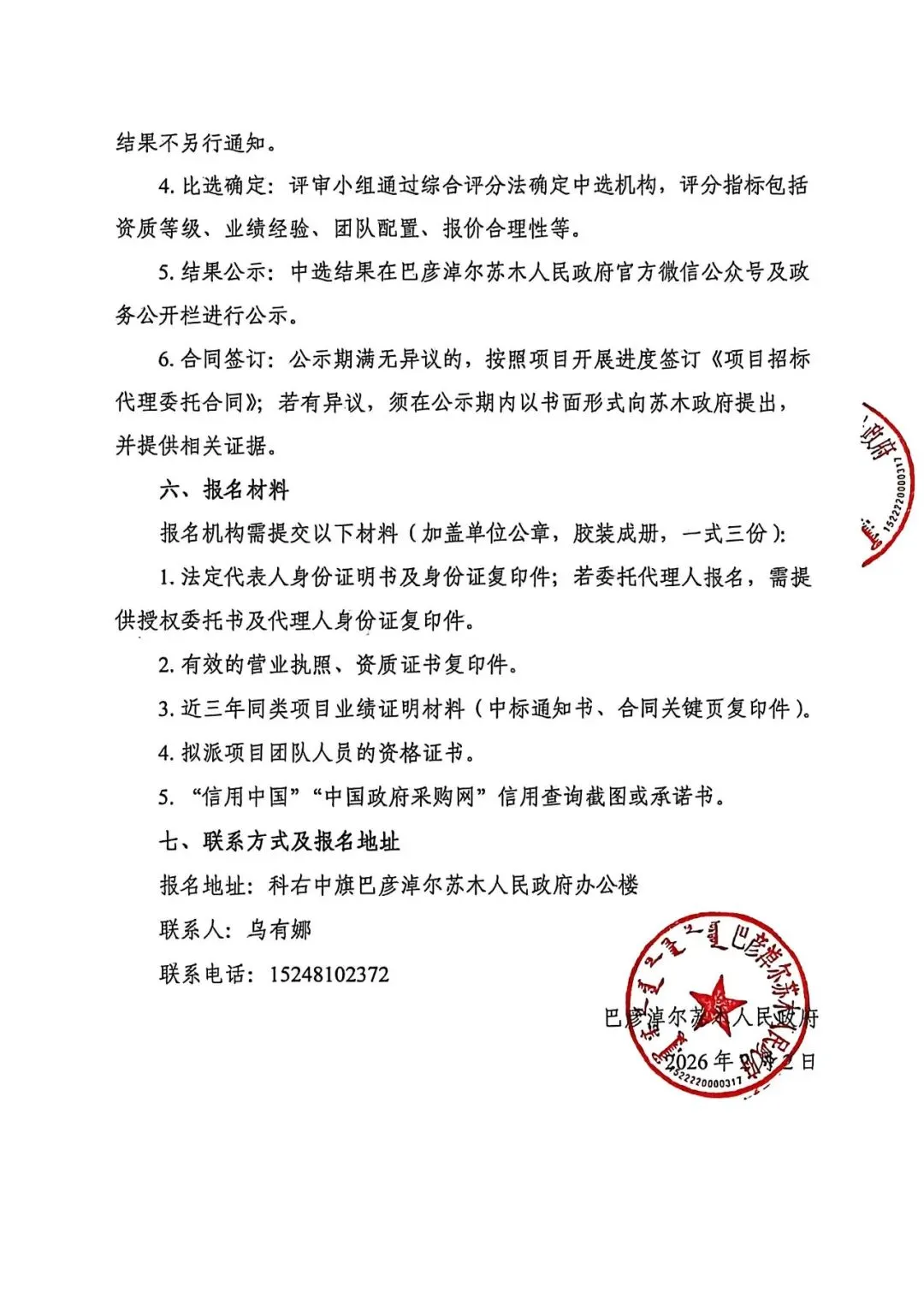 巴彦淖尔苏木人民政府关于公开选取项目招标代理机构的公告
