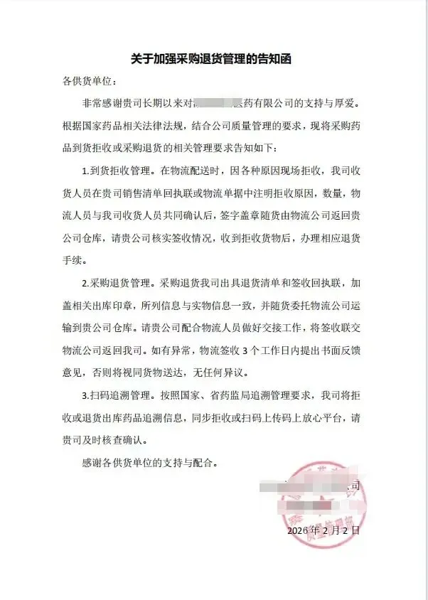 “GSP合规咨询”公众号,侧重专业性与权威感,发布法规解读、政策更新等核心内容,设置以下“八大菜单”: GSP合规实务指南、 医药法规深度解读、 两品一械质量合规、 药械许可政策解析、 GSP审计实战精要、 计算机系统合规π、 两品一械追溯前线。非常感谢贵司长期以来对我司的支持与厚爱。根据国家药品相关法律法规,结合我司质量管理的要求,现将采购药品到货拒收或采购退货的相关管理要求告知如下:1.到货拒收管理。在物流配送时,因各种原因现场拒收,我司收货人员在贵司销售清单回执联或物流单据中注明拒收原因,数量,物流人员与我司收货人员共同确认后,签字盖章随货由物流公司返回贵公司仓库,请贵公司核实签收情况,收到拒收货物后,办理相应退货手续。2.采购退货管理。采购退货我司出具退货清单和签收回执联,加盖相关出库印章,所列信息与实物信息一致,并随货委托物流公司运输到贵公司仓库。请贵公司配合物流人员做好交接工作,将签收联交物流公司返回我司。如有异常,物流签收3个工作日内提出书面反馈意见,否则将视同货物送达,无任何异议。3.扫码追溯管理。按照国家、省局追溯管理要求,我司将拒收或退货出库药品追溯信息,同步拒收或扫码上传码上放心平台,请贵司及时核查确认。免责声明:本公众号文章内容代表个人观点,仅供参考,由于各地监管政策不一,请咨询当地药品监管部门,按其意见执行。坚持每天更新一篇GSP相关小知识,为了避免错过每日推送,建议把本号设为星标或添加桌面!感谢关注本号,学习更多药械经营相关小知识!为了更好的学习邀您加入GSP合规咨询微信群。