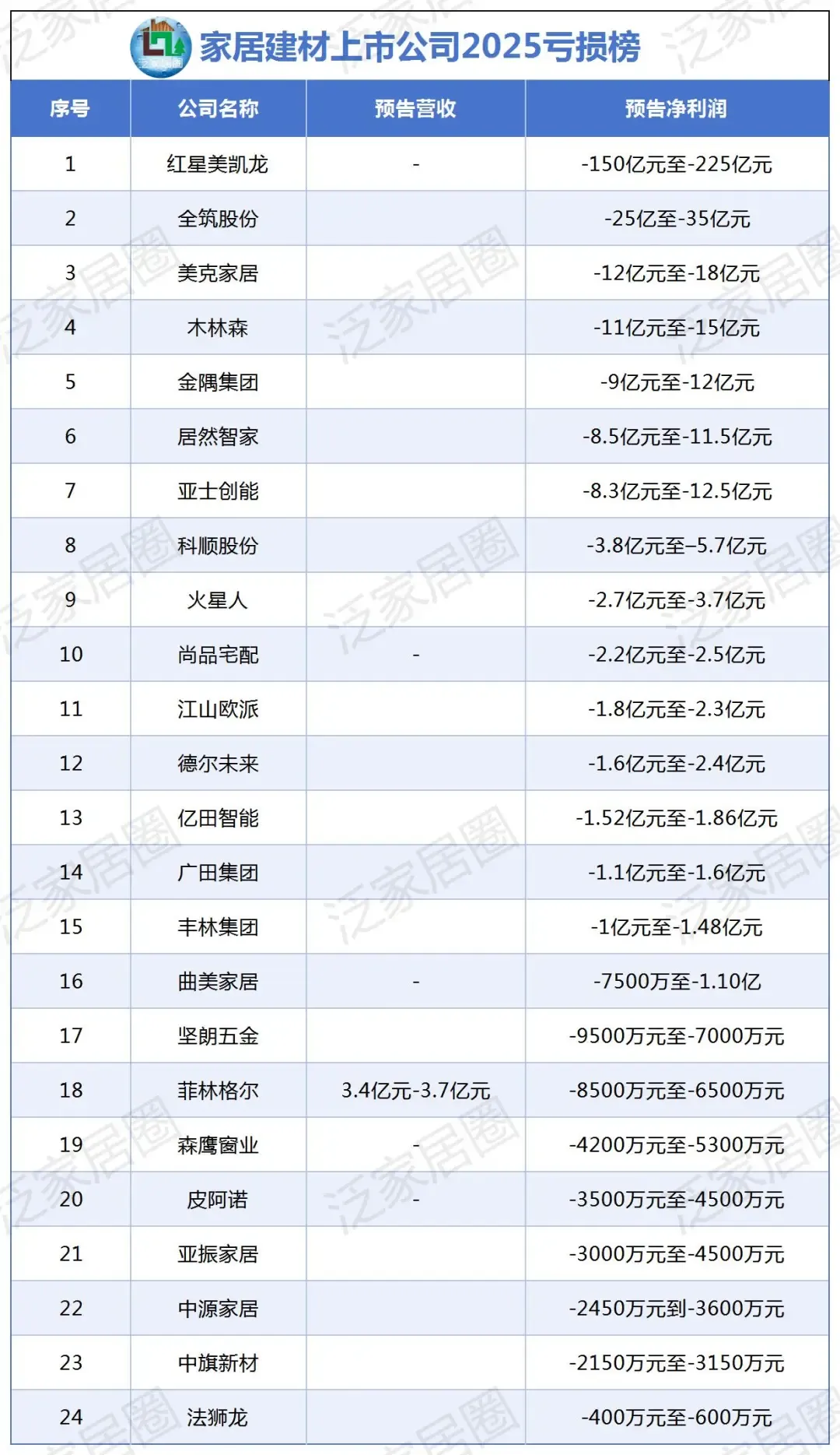 2026年初,家居建材行业2025年的业绩预告陆续披露,一张覆盖24家上市公司的“亏损榜”引发行业震动。数据显示,仅上榜企业的合计亏损额已超240亿元,头部企业红星美凯龙以150亿-225亿元的预亏额登顶“亏损王”,全筑股份、美克家居等企业也陷入巨额亏损,行业正经历一场前所未有的寒冬。