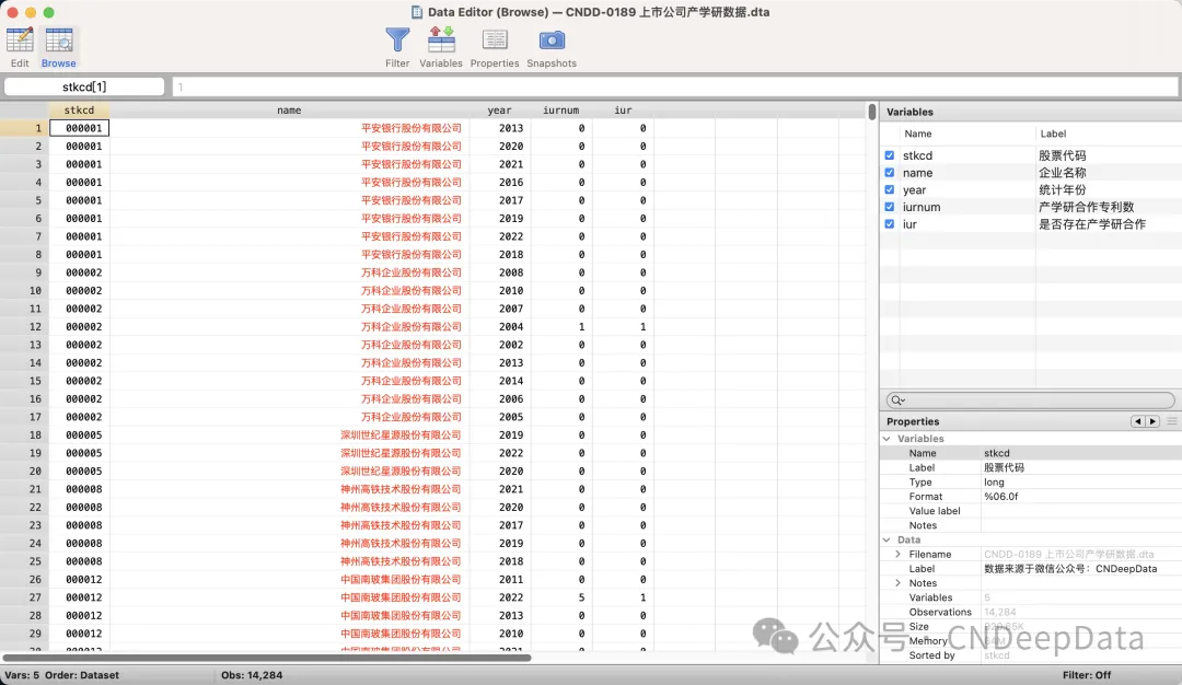 ▪ 数据说明:CNDD上市公司产学研数据包含上市公司代码、年份和上市公司产学研专利及虚拟变量指标。数据提供.dta和.xlsx格式,可用stata或excel打开。
