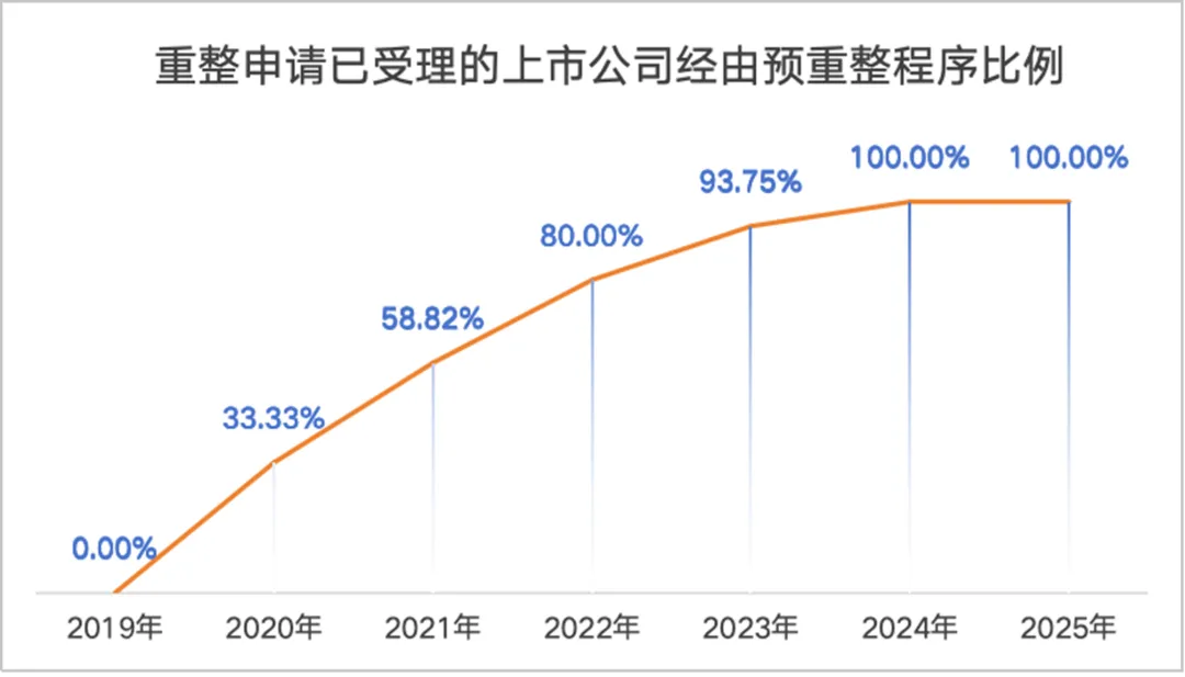 目前,在司法实践与企业重组的语境下,预重整程序已然成为上市公司在正式进入重整程序之前普遍采纳的默认选项。根据我国主板上市公司披露公告数据,自我国资本市场开始探索预重整制度以来,人民法院裁定受理正式重整申请的上市公司中,已前置启动预重整程序的比例由2019年的0.00%、2020年的33.33%,攀升至近两年的100%(详细数据见表1:重整申请已受理的上市公司是否经由预重整程序统计表;表2:重整申请已受理的上市公司是否经由预重整程序比例)。然而,预重整的操作规则主要散见于上海证券交易所、深圳证券交易所发布的自律监管指引之中,而我国现行的《企业破产法》以及新修订并征询意见的草案均未对预重整作出明确、具体的规定。