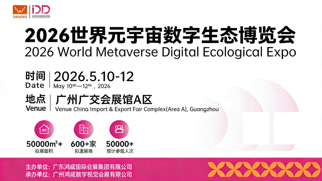 2026 年 5 月 10-12 日,2026 世界元宇宙数字生态博览会将登陆广州广交会展馆 A 区。作为连续成功举办 9 届的行业标杆展会,本届博览会携 50000+㎡超大规模、600 + 家优质展商、50000 + 精准观众,打造覆盖元宇宙全产业链的专业展贸平台,更有 23 届世界文旅产业博览会、10 届 VR/AR/XR 智能眼镜博览会等多场重磅展会同期联动,一次参会,多重收获!