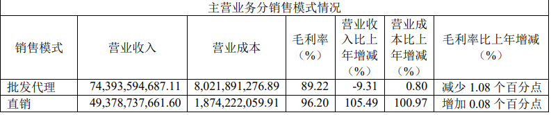 利润增长比营收还要快,一定程度上得益于茅台近年大力提升直销收入。2021年茅台主营业务收入中,直销收入的占比从前一年约14%大幅增长到22.7%,到了2022年直销收入翻倍增长到493.78亿元,占比大幅提升到39.7%,远远高于同行。