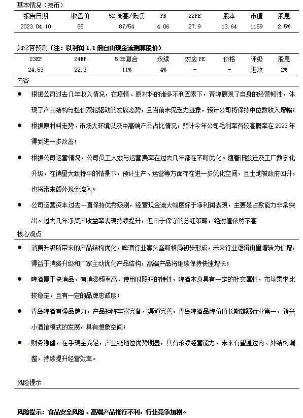 从风险角度看,由于啤酒行业属性与相对稳定市场格局,结合公司产品结构、价格、自身运营情况,预计公司有能力能够使得利润稳定于25-30亿元区间,取中枢换算30亿港币,若以参考国际啤酒业20倍PE计算对应约600亿港币。