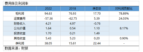 我们回溯公司过去4年对利润净增贡献的主要分类,以此反应公司利润增加的含金量。在统计中,毛润变化贡献了主要来源,运营费用改善次之(考虑到运输费用调节,实际运营费用贡献绝对值可能为-9亿),金融性资产收益贡献约8.2%,其他类收益增量不到1%。