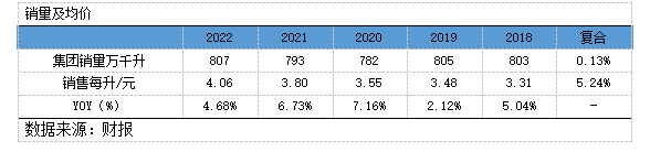 全年,公司营业收入321.7亿,同比增长6.65%,2022-2018年期间,复合增速4.89%。其中,集团销量口径807.2万千升,同比增长1.79%,期间复合增长为0.13%。据财报数据,行业内规模性企业销量口径期间复合增速为-1.64%,青啤总体销量由于行业表现。全年公司占规模性企业销量占比为22.62%,同比小幅度提升。