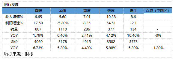 根据同行之间对比,国内厂商收入情况均出现增长,其中燕京增速最快,主要是收入及利润基数都较低,渠道改革所带来的增幅最突出。利润增长情况青啤表现最佳,华润表现不佳,主要是相关一次性收益带来干扰,核心利润增长依然保持稳定。
