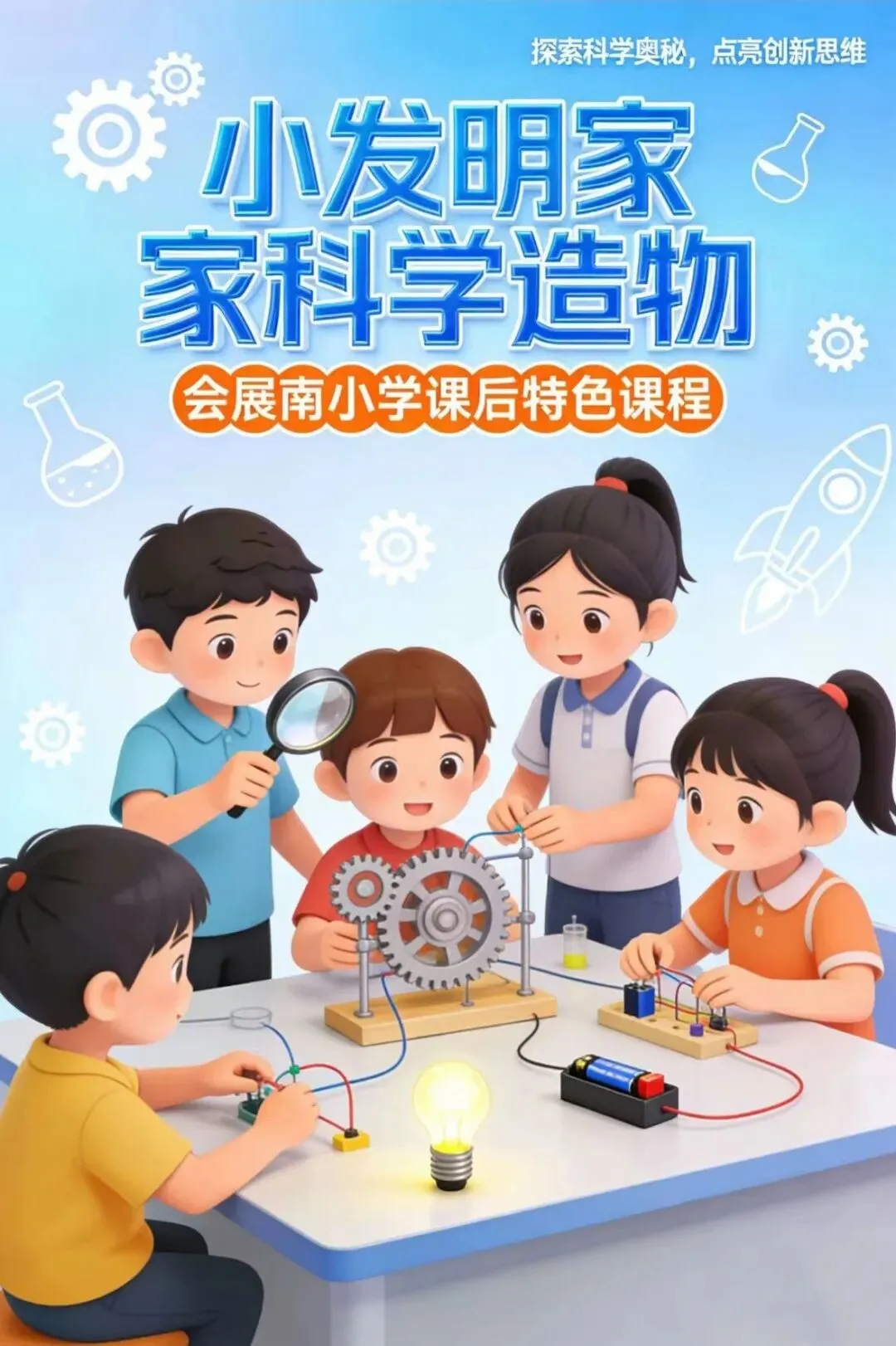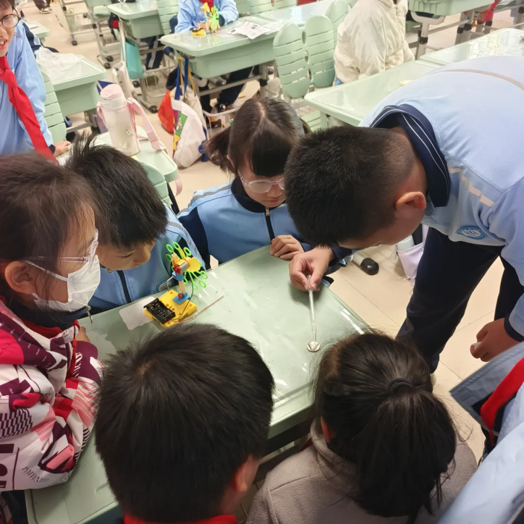 科学造物社团中,跟着“飞飞博士”,孩子们成为了一个个小创客。他们从生活中发现问题,用小小的双手把奇思妙想变成会动、会亮、能完成任务的科学作品。在有趣的故事和挑战中,齿轮传动、电路连接这些知识都活了起来。我们最珍视的,不是完美的作品,而是他们眼中闪烁的好奇,和举起成果时那份“我能创造”的笃定与骄傲。在这里,科学的种子,正用温暖的方式生根发芽。
