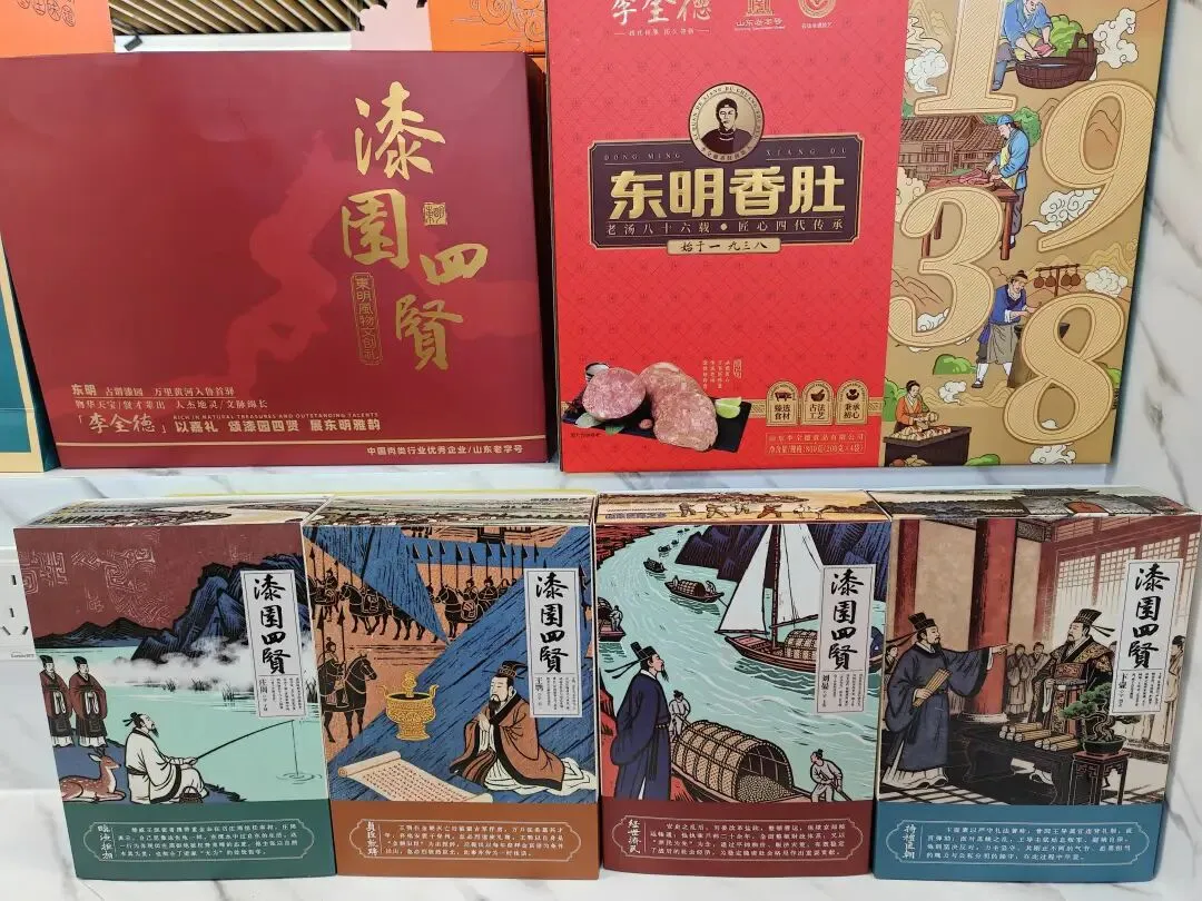 “漆园四贤”文创礼盒是品牌深挖东明地域人文底蕴的成果:以庄子、刘晏、卞壸、王鹗四位东明历史文化名人为核心灵感设计包装,内搭经典东明香肚、香肠之外,更首次推出依托传统非遗工艺打造的香卤牛肉与酱香猪蹄,实现“文化IP+非遗美食”的双重突破。