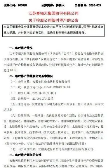 某上市光伏企业停产改造!1月29日,赛福天发布公告,其控股公司安徽美达伦光伏科技有限公司(以下简称“安徽美达伦”)依据年度生产经营规划,要对部分生产线开展停产检修与设备更新改造工作,计划近期临时停产,临时停产时长预计不超60天。