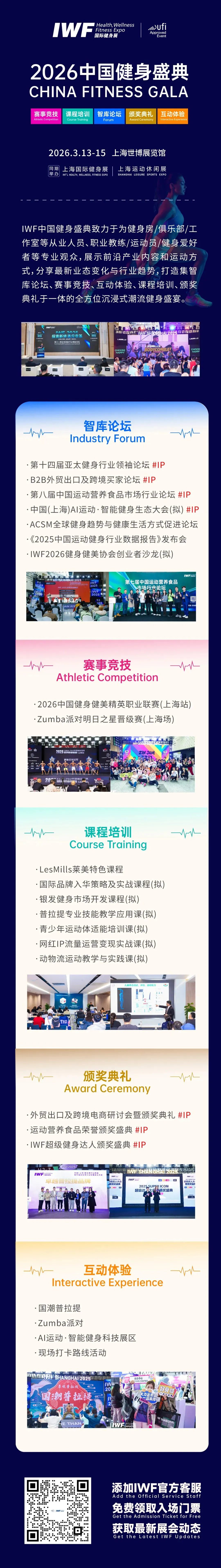 IWF不仅将呈现来自全球的知名品牌及其最新产品,更有贯穿全产业链的深度论坛峰会、职业竞技赛事、教育课程培训、运动健身表演、行业颁奖典礼、打卡福利抽奖等一系列丰富多彩的现场活动,为参展商、采购商、专业观众、从业者和爱好者打造集展览展示、贸易对接、合作交流、体验互动于一体的中国健身盛典。