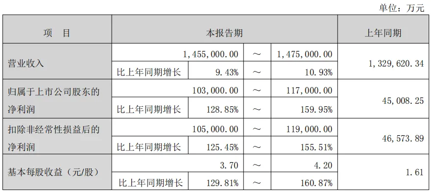 经公司财务部门初步测算,润丰股份预计2025年实现营业收入145.5亿~147.5亿元,同比增长9.43%~10.93%;归母净利润10.3亿~11.7亿元,同比增长128.85%~159.95%;扣非净利润预计10.5亿~11.9亿元,同比增长125.45%~155.51%;基本每股收益3.70~4.20元/股,同比增长129.81%~160.87%。