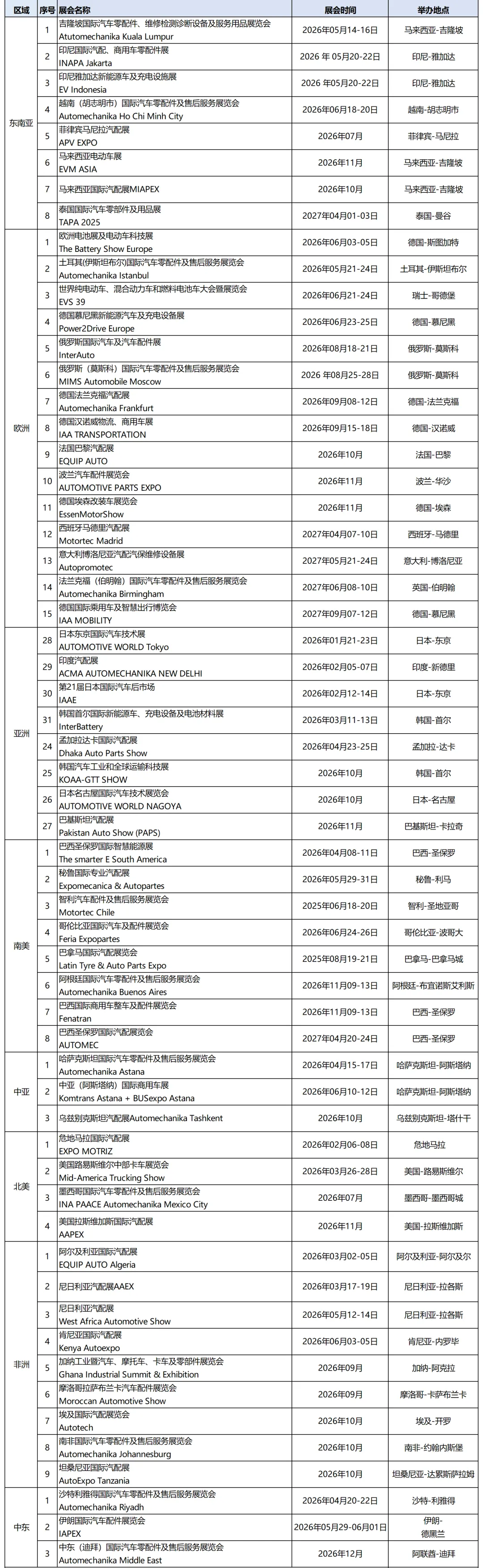 2026年全球汽配展会计划表